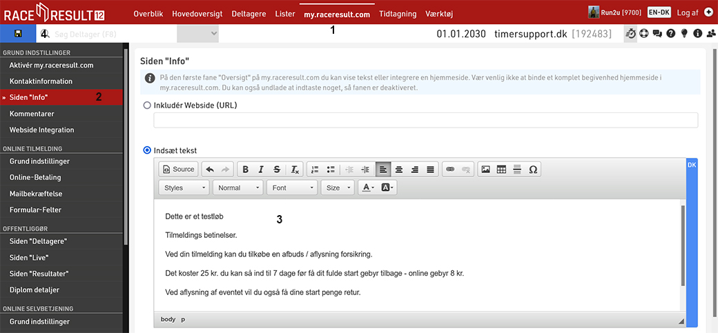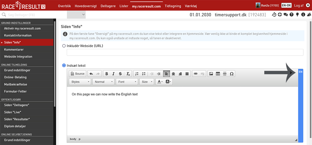 På siden her vises hvordan du ændre i teksten på info siden, det er muligt at skifte sprog på siden også.