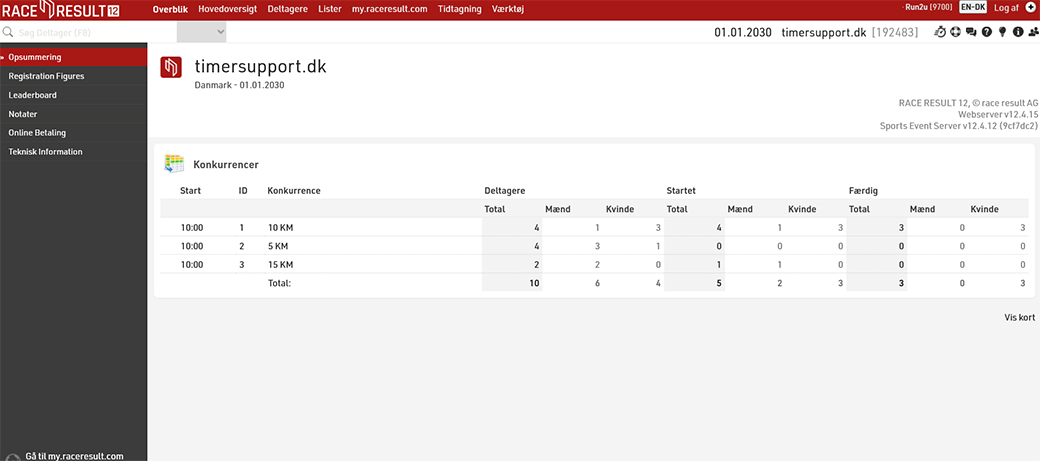 Under opsummering, har du hele tiden et overblik over hvor mange der er tilmeldt de enkelte distancer, og om de er startet og hvor mange der er kommet i mål.